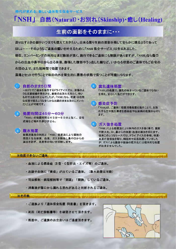 「NSH」はご遺体の腹部に「腹水」や「ガス」が以上に増え肥大化したときや、3日以上ご遺体をお寝かせするとき、鼻や口から出血・液体の漏出があるときに処置いたします。 この処置により、腹水やガスを除去し、鼻や口からの出血・液体等の漏出を防ぎ・遺体保存液を体内に注入することにより、長期間(~6日間)でもご遺体の腐乱・腐敗を抑制することが可能です。